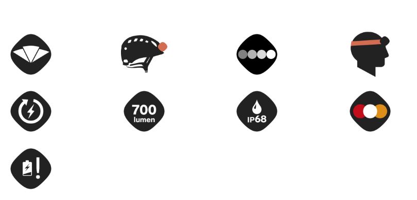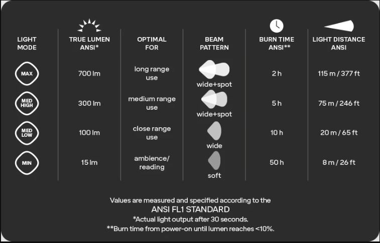 700 lm valgusvihk. Neli töörežiimi - max (700 lm, 2-3h), med high (300 lm, 4,5-5h), med low (100 lm, 10h), min (15 lm, 50h)